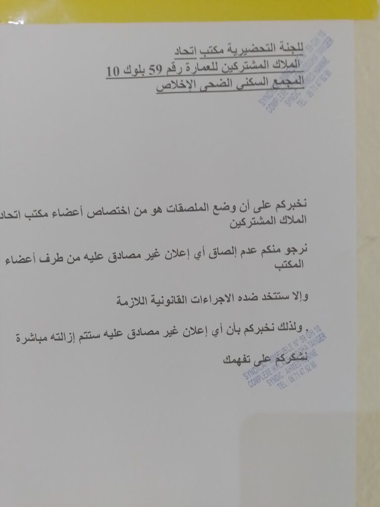 اللجنة التحضيرية مكتب اتحادالملاك المشتركين للعمارة رقم 59 بلوك 10المجمع السكني الضحى الإخلاصالموضوع : إشعار بانعقاد الجمع العام التجديدي لمكتب اتحاد الملاك المشتركينللعمارة رقم 59 بلوك 10 المجمع السكني الضحى الإخلاص طريق تطوان – طنجةسلام تام بوجود مولانا الإماموبعدعلاقة بالموضوع المشار إليه أعلاه ، يشرفنا أن نخبر سيادتكم أننا سنعقد اجتماعات لتجديد مكتب اتحاد الملاك…