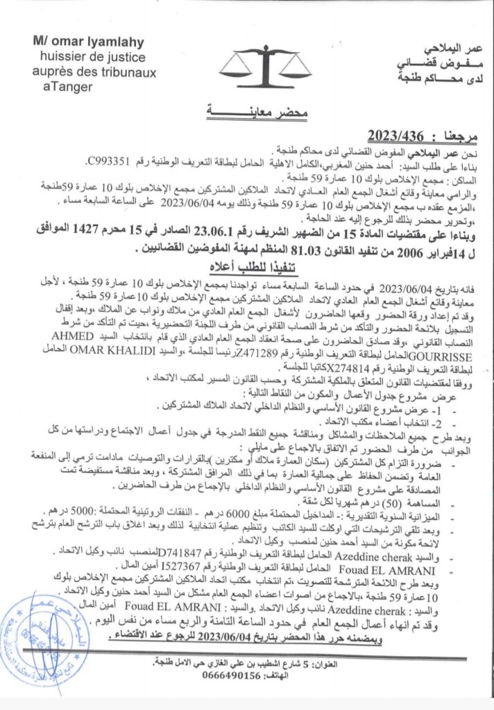 معاينة العون القضائي: محضر الجمع العام لتجديد اتحاد الملاك المشتركين 2023/06/04